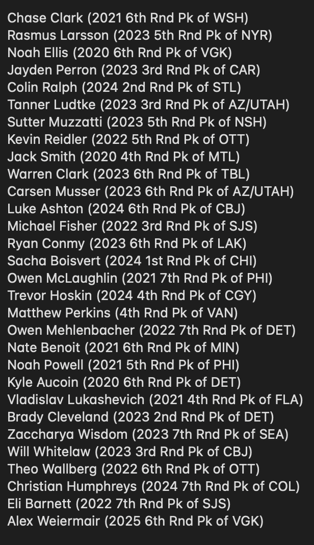 Here’s some non-drafted prospects who transferred this last year who are currently leading their teams in scoring as well… Brett Rylance (AIC -> Long Island), Michael Citara (Merrimack -> Alaska Fairbanks), Josh Zary (Long Island -> Ferris State), Matteo Giampa (Canisius -> Miami), Tristan Lemyre (Western Michigan -> Minnesota State), Caiden Gault (Ferris State -> Northern Michigan), Ryan Taylor (Clarkson -> Robert Morris), Alex Gaffney (Harvard -> St. Thomas), Matthew Romer (Northern Michigan -> Stonehill), Luc Wilson (Minnesota State -> RPI) and Tyler Dunbar (Colorado College -> Union).